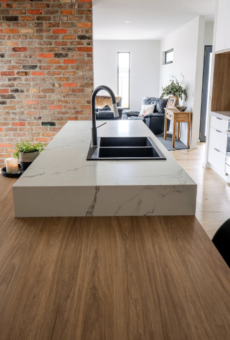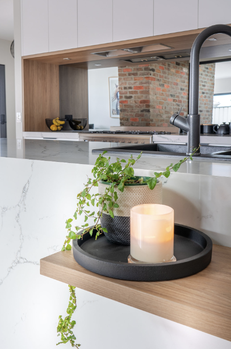The iconic Glacier slab, nestled at the heart of the island, seamlessly anchored the design, while the harmonious blend of pristine whites, earthy wooden accents, and rustic brick elements added warmth and character.
