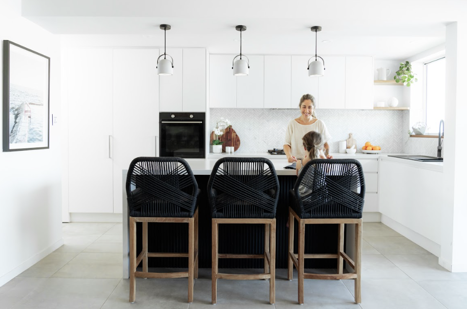 The centerpiece of this masterpiece is the iconic magnolia slab adorning the central island, beautifully complemented by the sleek white kitchen cabinets. The juxtaposition of the cool kitchen tones and the pristine whites not only exudes a sense of modernity but also imparts a welcoming warmth to the space